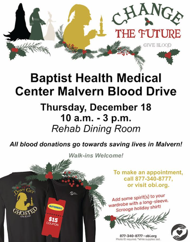 Name: Blood Drive - Baptist Health Medical CenterDate: December 18, 2025Time: 10:00 AM - 3:00 PM CSTWebsite: http://obi.org