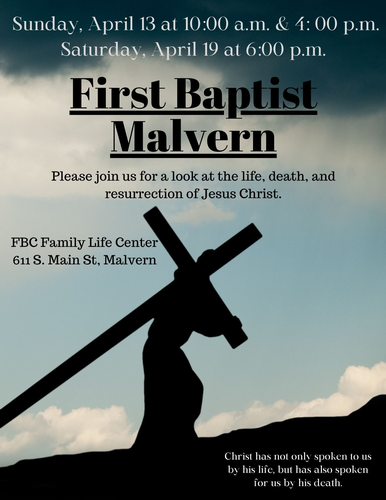Please join us for a look at the life, death and resurrection of Jesus ChristLocation:First Baptist Church