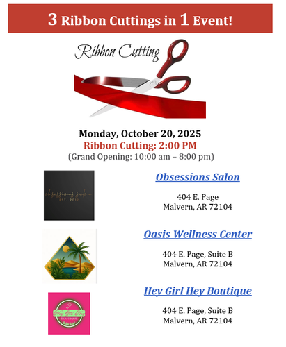 Name: Grand Opening & Ribbon Cutting - Obsessions Salon, Oasis Wellness Center, Hey Girl Hey BoutiqueDate: October 20, 2025Time: 2:00 PM - 3:00 PM CDTEvent Description:Grand Opening & Ribbon Cutting
