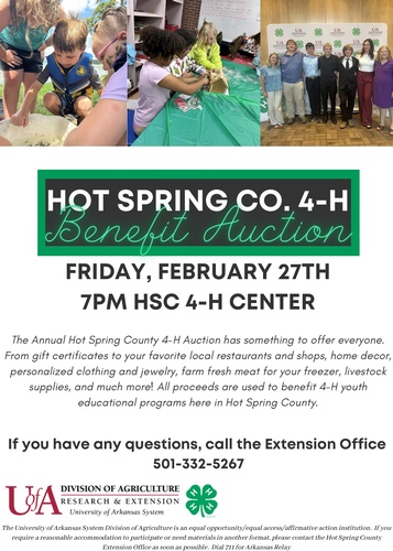 Name: Hot Spring County 4H Benefit AuctionDate: February 27, 2026Time: 7:00 PM - 10:00 PM CST