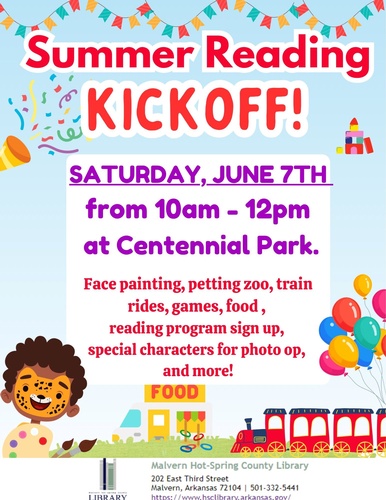 Name: Summer Reading Program Kick-Off EventDate: June 7, 2025Time: 10:00 AM - 12:00 PM CDTWebsite: https://www.hsclibrary.arkansas.gov/